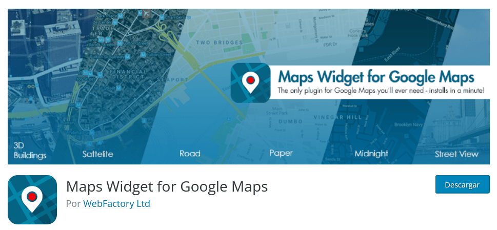 Por último, pero no menos importante, Google Maps widget es uno de los mejores plugins de Google Maps para WordPress. La configuración de este plugin en particular es extremadamente sencilla. Te permite incluir mapas en tamaño pequeño en la barra lateral de WordPress, que los visitantes pueden ampliar con un clic.