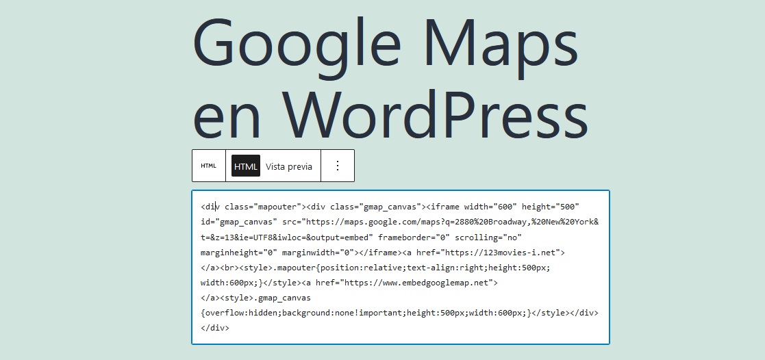 La desventaja de este método es que debes crear nuevos códigos de inserción para cada mapa que desees incluir en tu sitio web. La ventaja es que una vez que agregues un mapa a través de HTML, podrás verlo en la pestaña visual de tu editor.
