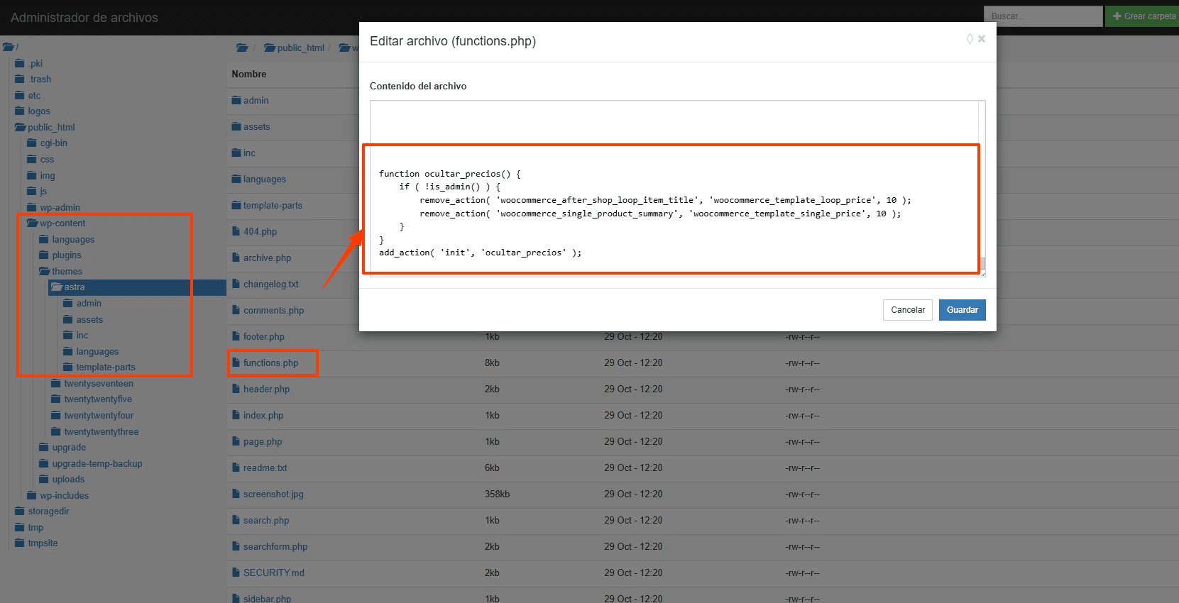 Añade el siguiente código al archivofunctions.phpde tu tema activo:function ocultar_boton_carrito() { remove_action( 'woocommerce_after_shop_loop_item', 'woocommerce_template_loop_add_to_cart', 10 ); remove_action( 'woocommerce_single_product_summary', 'woocommerce_template_single_add_to_cart', 30 ); } add_action( 'init', 'ocultar_boton_carrito' ); - Guarda los cambios: