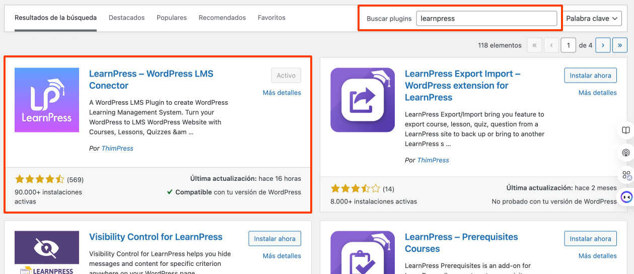 LearnPress está disponible en el repositorio oficial de plugins de WordPress. Solo necesitas buscarlo, instalarlo y activarlo. Además, encontrarás una serie de complementos adicionales desarrollados por ThimPress que amplían las funcionalidades de LearnPress, muchos de ellos gratuitos.