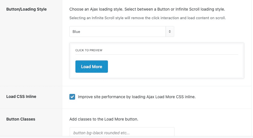 - Selecciona el diseño del botón de carga o, si prefieres que los posts carguen automáticamente sin necesidad de hacer clic, selecciona la opción de scroll infinito automático.