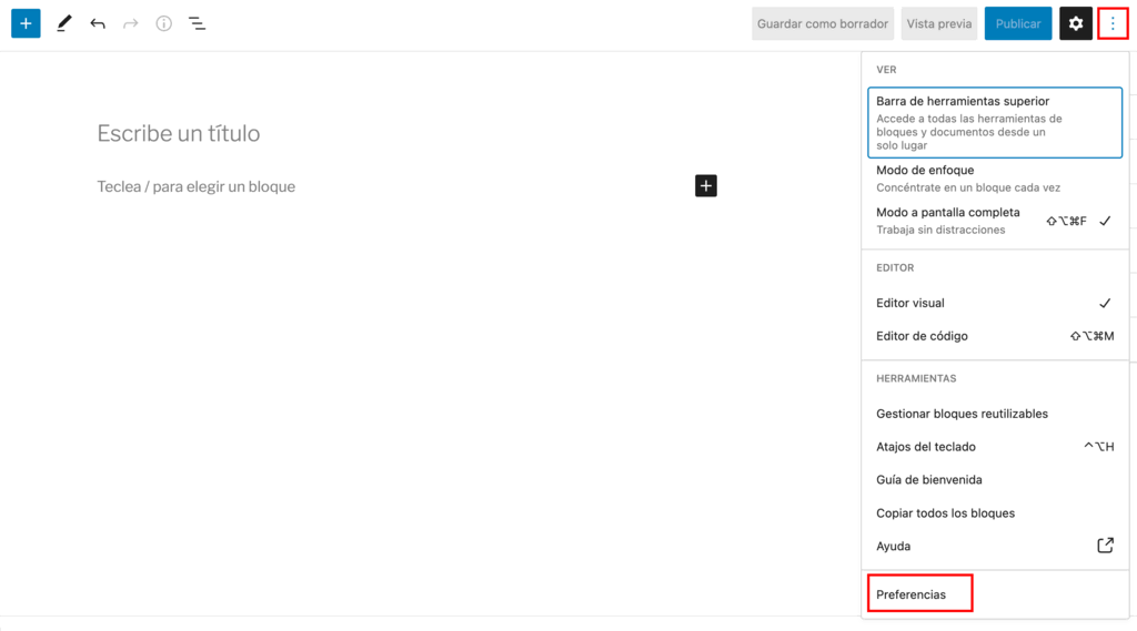 Si estás utilizando el editor de bloques Gutenberg, selecciona el menú de «Opciones» en la esquina superior derecha del editor y elige la opción «Preferencias».