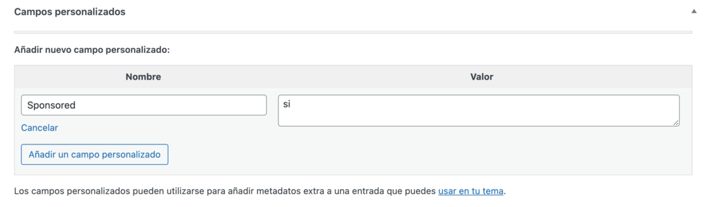 A modo de ejemplo, si queremos añadir un descargo de responsabilidad a una publicación patrocinada, establecemos Sponsored o Patrocinado como nombre y rellenamos  o No en la casilla de valor para mostrar si la publicación estaba patrocinada o no.