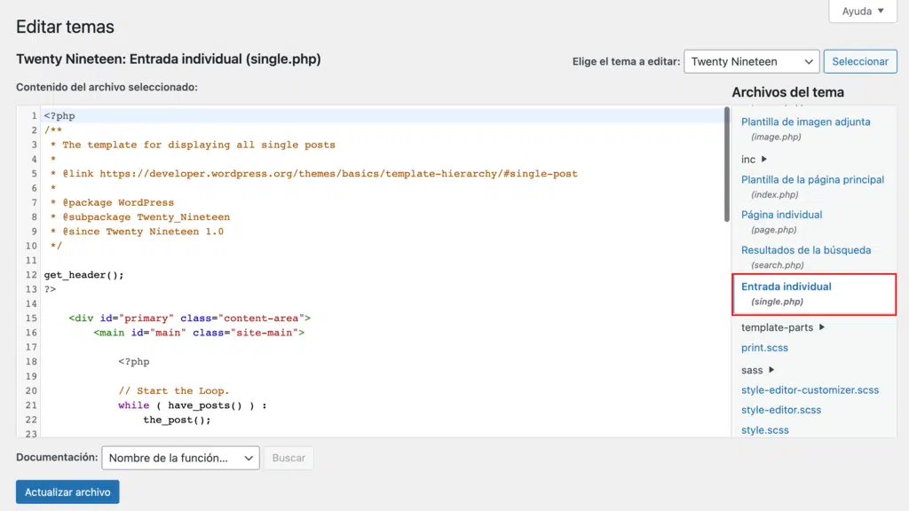 Una vez que hayas incorporado correctamente el código en el editor de temas, haz clic en el botón Actualizar archivo para guardar los cambios.