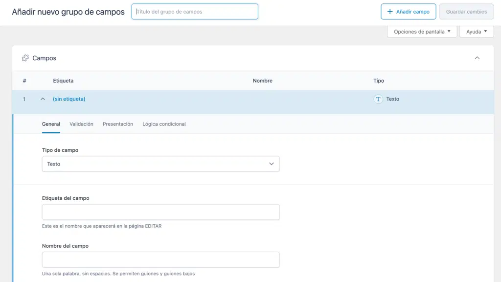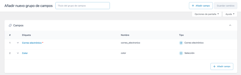 Al hacer se añadirá automáticamente tu grupo de campos personalizados a la lista. Para añadir más campos personalizados, solo tienes que elegir el botón Añadir campo y así sucesivamente.