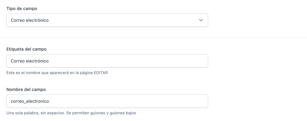 En este ejemplo, vamos a crear un campo de Correo electrónico.