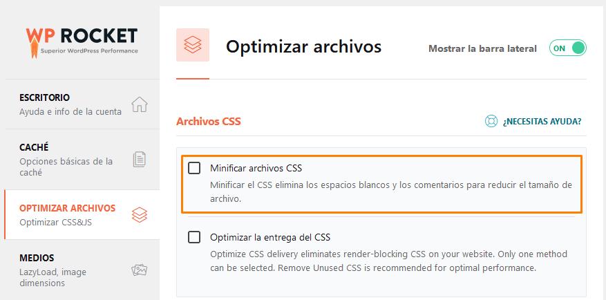 - Optimización de archivos estáticos: WP Rocket te permite optimizar archivos estáticos, como CSS y JavaScript. Habilita la opción de «Minificación» para reducir el tamaño de estos archivos, mejorando así la velocidad de carga de tu sitio.