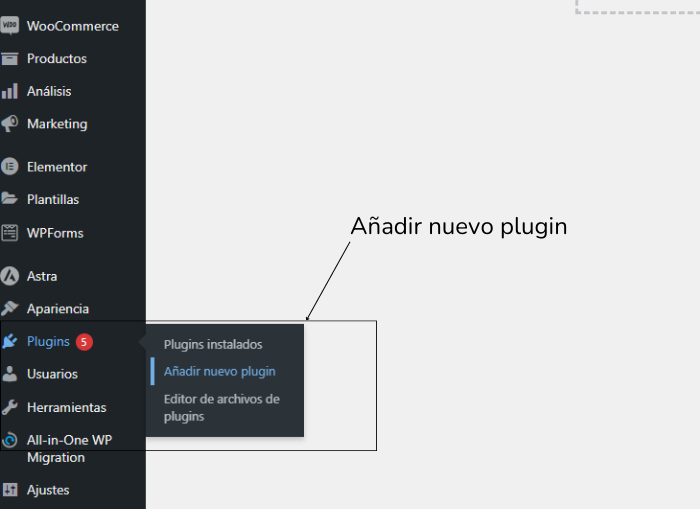 1-Comenzando desde el panel de administración de WordPress, dirígete al menú «Plugins» y selecciona «Añadir nuevo».