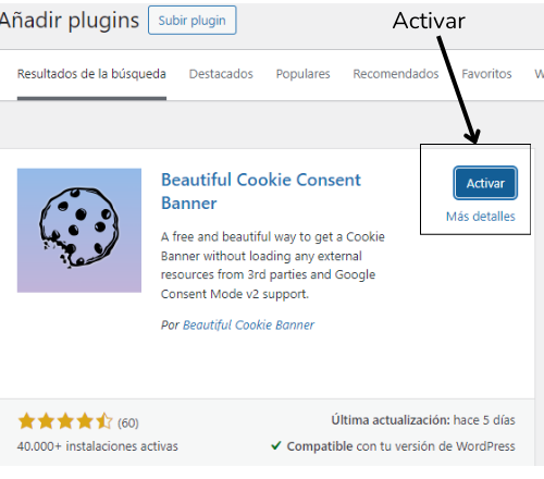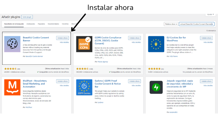 2-Busca el plugin «Beautiful Cookie Consent Banner» y luego haz clic en «Instalar ahora».