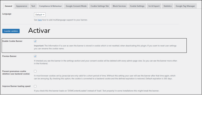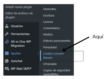 4. Luego accedemos a la pestaña de Ajustes > Cookie Consent Banner.