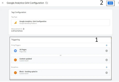 En este ejemplo, este trigger se ha añadido en la tag de Google Analytics, añádelo en todas las tags que utilices. Por último, haz clic en Save.