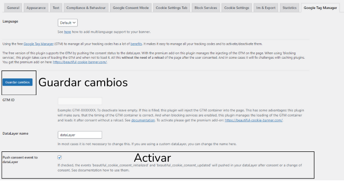 1-En el menú de configuración del complemento, activa las opciones «Habilitar las opciones Enable Cookie Banner y Push consent event to dataLayer«. Luego, haz clic en «Guardar cambios».