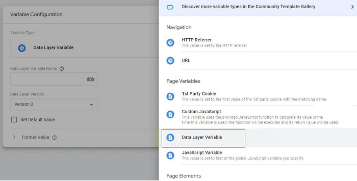 4. En la configuración sobre el tipo de variable selecciona Data Layer Variable.