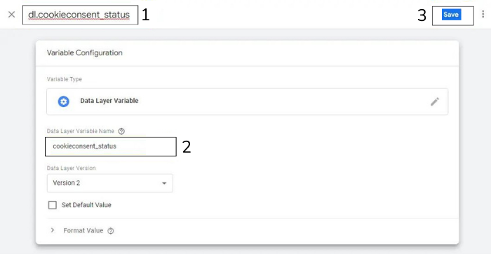 5. Luego se define un nombre para la variable como en los campos marcados a continuación y se debe hacer clic en Save.