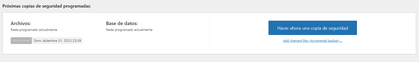 Puedes instalarlo y activarlo de la misma manera que lo hiciste con Wordfence. Luego, ve a Configuración > Copias de seguridad de UpdraftPlus y selecciona Hacer copia de seguridad ahora: