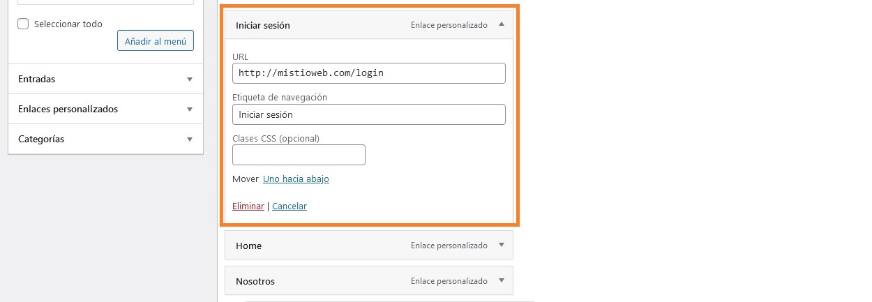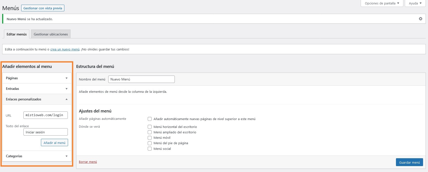Los elementos aceptados incluyen páginas, entradas y categorías. Para que los usuarios accedan a tus posts o páginas de destino, puedes agregar enlaces personalizados como elementos del menú.