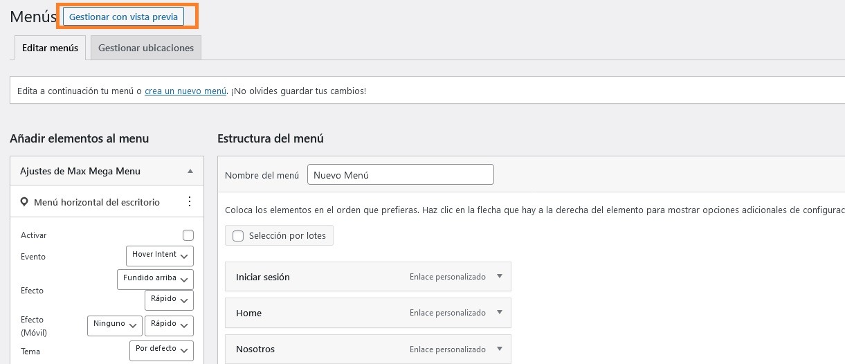 Selecciona el botón Gestionar con vista previa en vivo en la parte superior de la página si necesitas una vista previa visual al cambiar la ubicación del menú. El modo de vista previa en vivo es particularmente ventajoso cuando se crea un menú desplegable complejo con múltiples niveles.