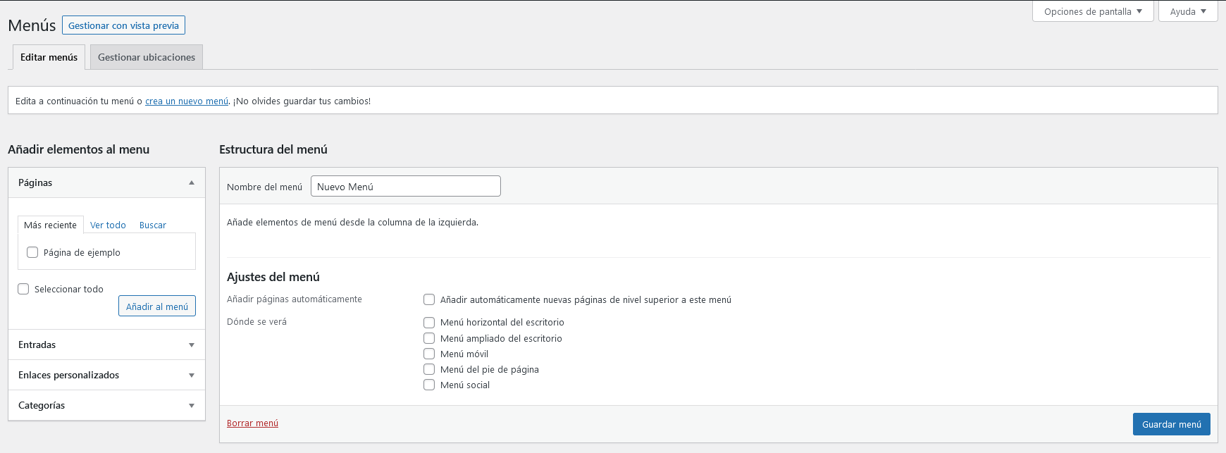Debemos crear el menú estándar primero. En el panel de control de WordPress, accede al apartado de Apariencia y luego a Menús. Dentro de la pestaña Editar menús, encontrarás la sección Estructura del menú, donde podrás crear un nuevo menú.