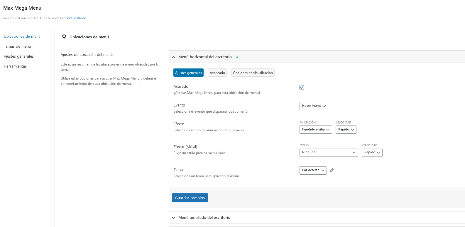 2. Puedes acceder al Mega Menú a través del panel de control de WordPress. En la sección Ubicaciones del menú, haz clic en el menú principal. Para activar la funcionalidad del menú desplegable, marca la casilla correspondiente. Dentro de la misma sección, selecciona el evento que activa la animación del submenú del menú desplegable en el escritorio y el dispositivo móvil. Luego selecciona «Guardar cambios».