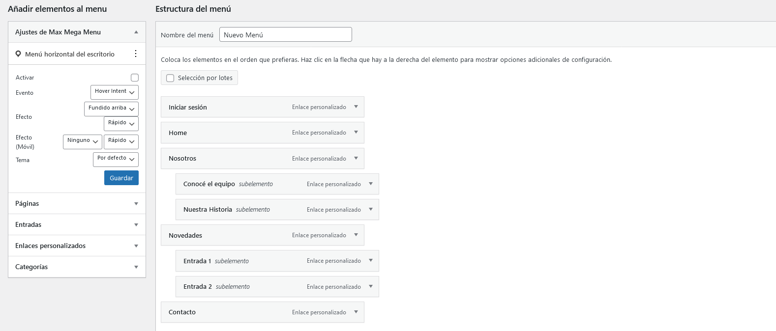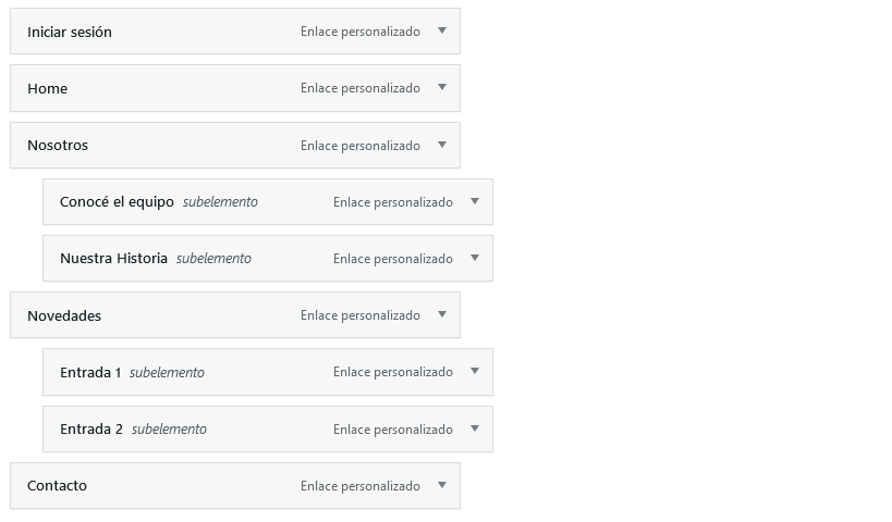 Los elementos del menú que se han seleccionado anteriormente se mostrarán en la sección Estructura del menú. Arrastra y suelta los elementos y subconjuntos en el orden que desees.