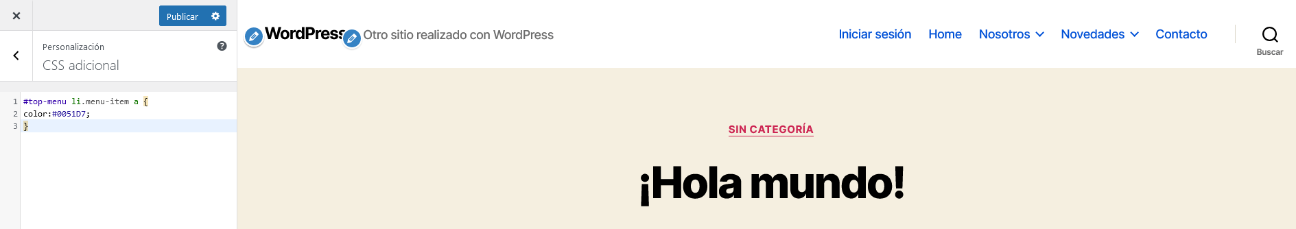 Ve a la función Apariencia -> Personalizar desde tu panel de control de WordPress y usa la función CSS adicional para añadir tu propio código. En este ejemplo, cambiamos el color de la fuente superior del menú a azul.