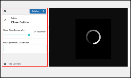 Después, es recomendable ofrecer a los usuarios una opción para cerrar la animación, especialmente si has configurado un Tiempo Máximo de Carga más prolongado. Para agregar un botón de cierre, haz clic en ‘Botón Cerrar’ y luego ajusta la configuración según tus preferencias.