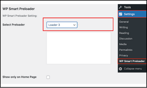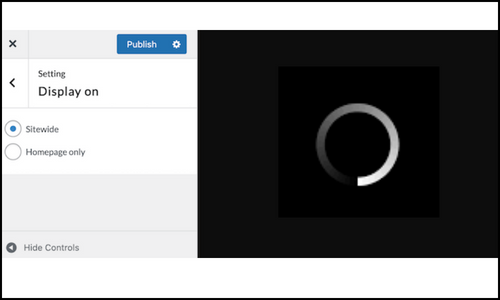 Para comenzar, haz clic en «Mostrar en». En esta pantalla, puedes elegir si deseas utilizar el mismo precargador en todo tu blog de WordPress o solo en la página de inicio.