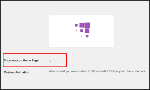Por omisión, la animación se mostrará en todo tu sitio web de WordPress. Sin embargo, si lo prefieres, puedes optar por usarla únicamente en tu página de inicio marcando la casilla «Mostrar solo en la página de inicio».