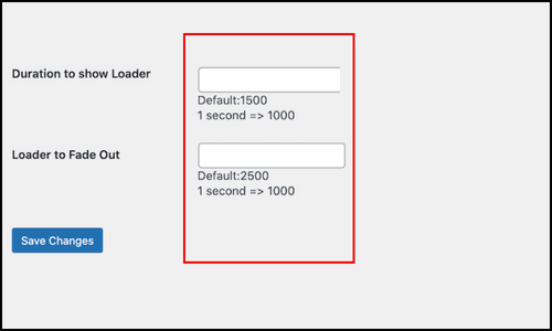 De manera predeterminada, la animación tardará 2500 milisegundos o 2,5 segundos en desaparecer por completo. Para ajustar este tiempo, simplemente ingresa un número mayor o menor en el campo «Cargador para desvanecerse».