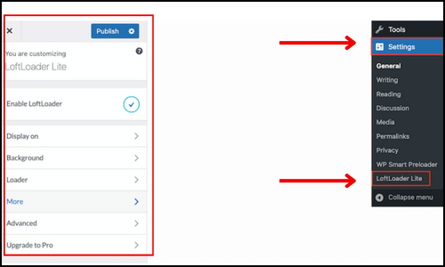 Una vez activado, dirígete a «Ajustes» > «LoftLoader Lite» para configurar los ajustes del complemento. LoftLoader Lite se integra con el Personalizador de temas de WordPress, por lo que esta pantalla te resultará familiar.