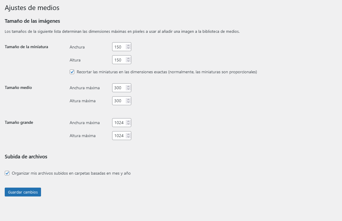 Hay tamaños «miniaturas», «medip» y «grande» en la página de Configuración de medios. Según sea necesario, puedse cambiar el número de píxeles de cada uno de ellos.