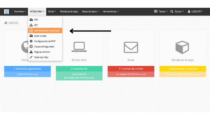 - Ingresas a tu hosting y te diriges al menú de «Mi sitio web», luego «Administrador de archivos». En nuestro caso usamos el Panel Ferozo, pero hay varios controladores de paneles, según tu proveedor de hosting.