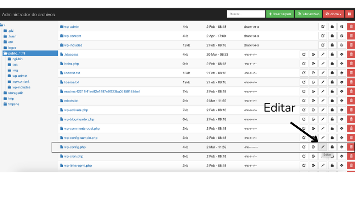 - Ahora abre el directorio public_html de tu instalación de WordPress y localiza el archivo wp-config.php. Con el botón derecho del ratón, selecciona la opción «Editar».