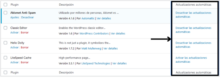 Podemos comprobar si están activadas accediendo, por ejemplo, a la sección de plugins de WordPress. Allí veremos una columna llamada «Actualizaciones automáticas» que nos permitirá habilitar o deshabilitar esta opción para cada uno de los plugins o temas de nuestra web.