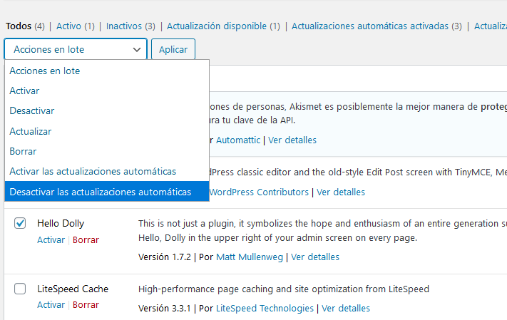 ¿Y tengo que hacer esto de forma manual con cada plugin que tengo instalado? Claro que no. Podemos seleccionar todos los plugins para los cuales queremos desactivar las actualizaciones automáticas y, en el menú desplegable «Acciones en lote», seleccionar la opción «Desactivar actualizaciones automáticas».