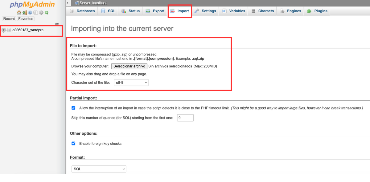 - Usa la opción «Importar» para subir el archivo SQL de la copia de seguridad.