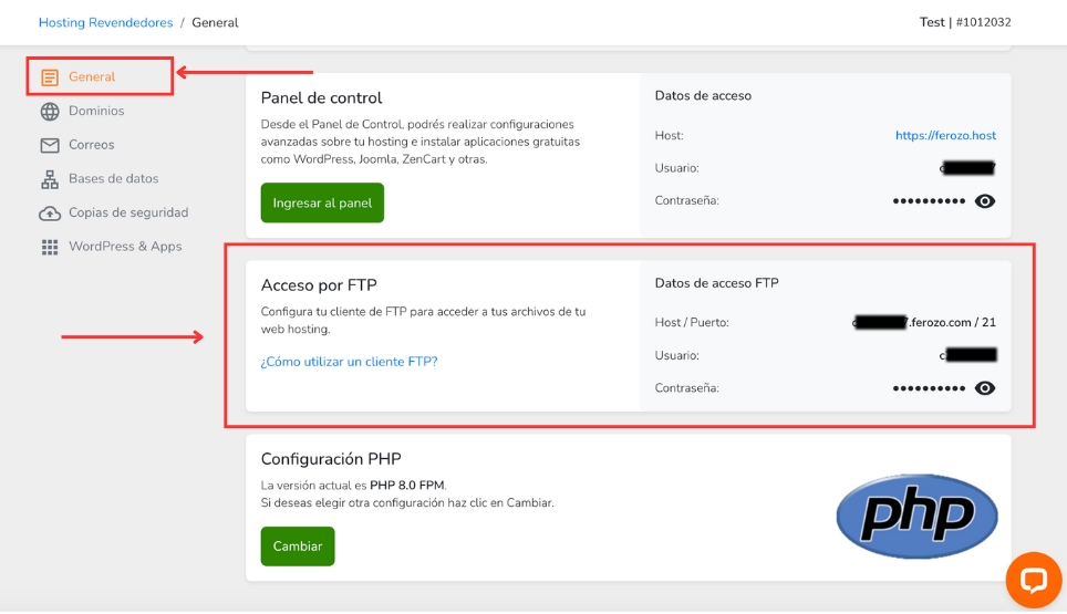 - Introduce las credenciales FTP (host, nombre de usuario y contraseña) y conéctate al servidor. Es importante obtener estas credenciales desde la sección correspondiente en el panel de control de tu proveedor de hosting. A continuación, se muestra una imagen ilustrativa de dónde encontrar esta información en el panel de control.