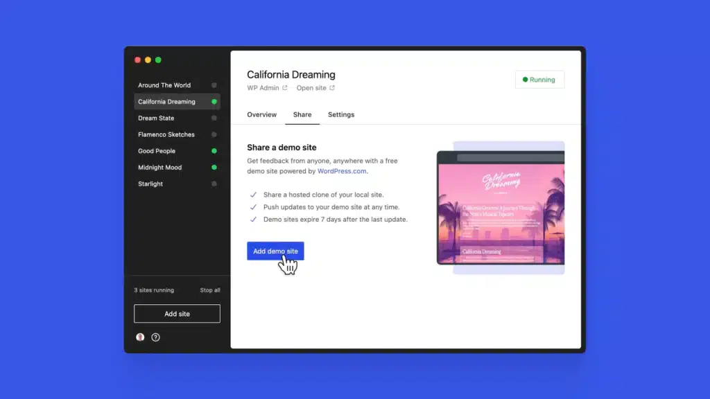 Estos sitios demo de acceso público están alojados en WordPress.com, proporcionando una manera fácil y eficiente de mostrar tu trabajo sin necesidad de configuraciones complicadas de servidor ni largos procesos de implementación. En menos de 15 segundos, puedes generar un enlace a tu sitio local para compartir, el cual estará disponible durante siete días.