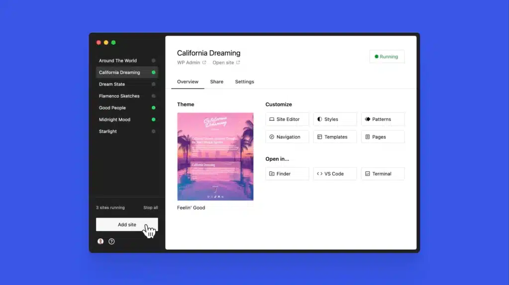 Una vez que tu sitio local esté en funcionamiento, tendrás acceso inmediato a WP Admin, al Editor de Sitios, a estilos globales y a patrones, todo con un solo clic. No necesitarás recordar ni introducir nombres de usuario o contraseñas, lo que agiliza significativamente tu flujo de trabajo.
