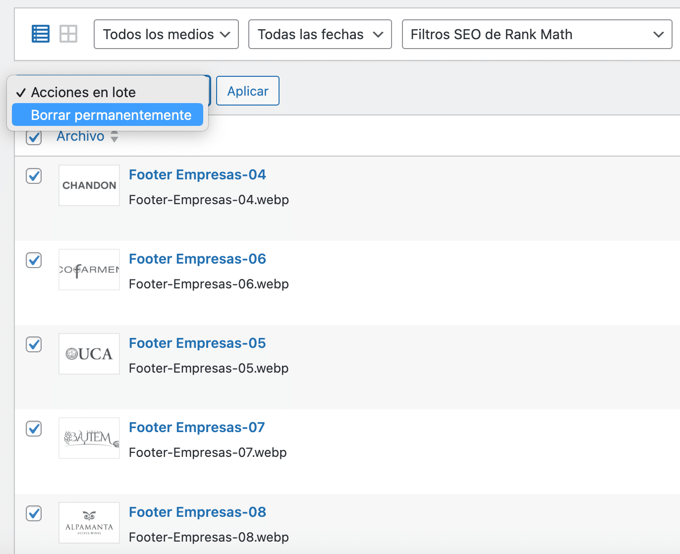 Finalmente, se revisan las imágenes no utilizadas y se eliminan en masa para liberar espacio en el servidor. Esta acción contribuye a eliminar imágenes no utilizadas en WordPress, optimizando el almacenamiento y mejorando la eficiencia del sitio.
