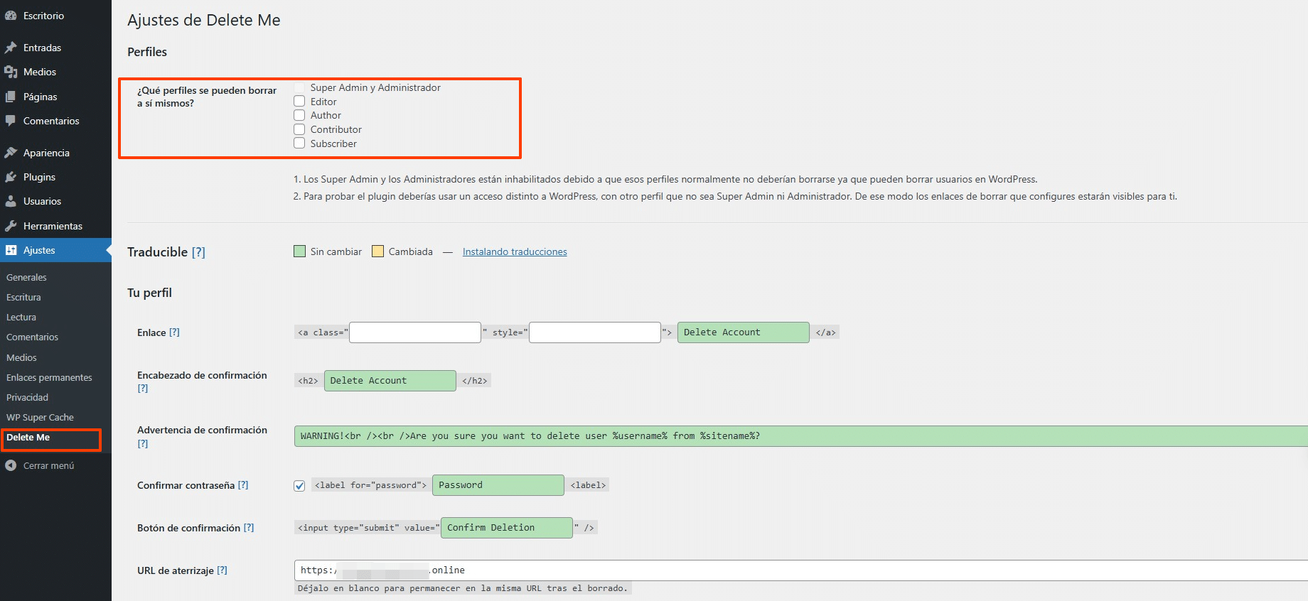 - Después de activar el plugin, ve a Ajustes > Delete Me en el panel de administración.