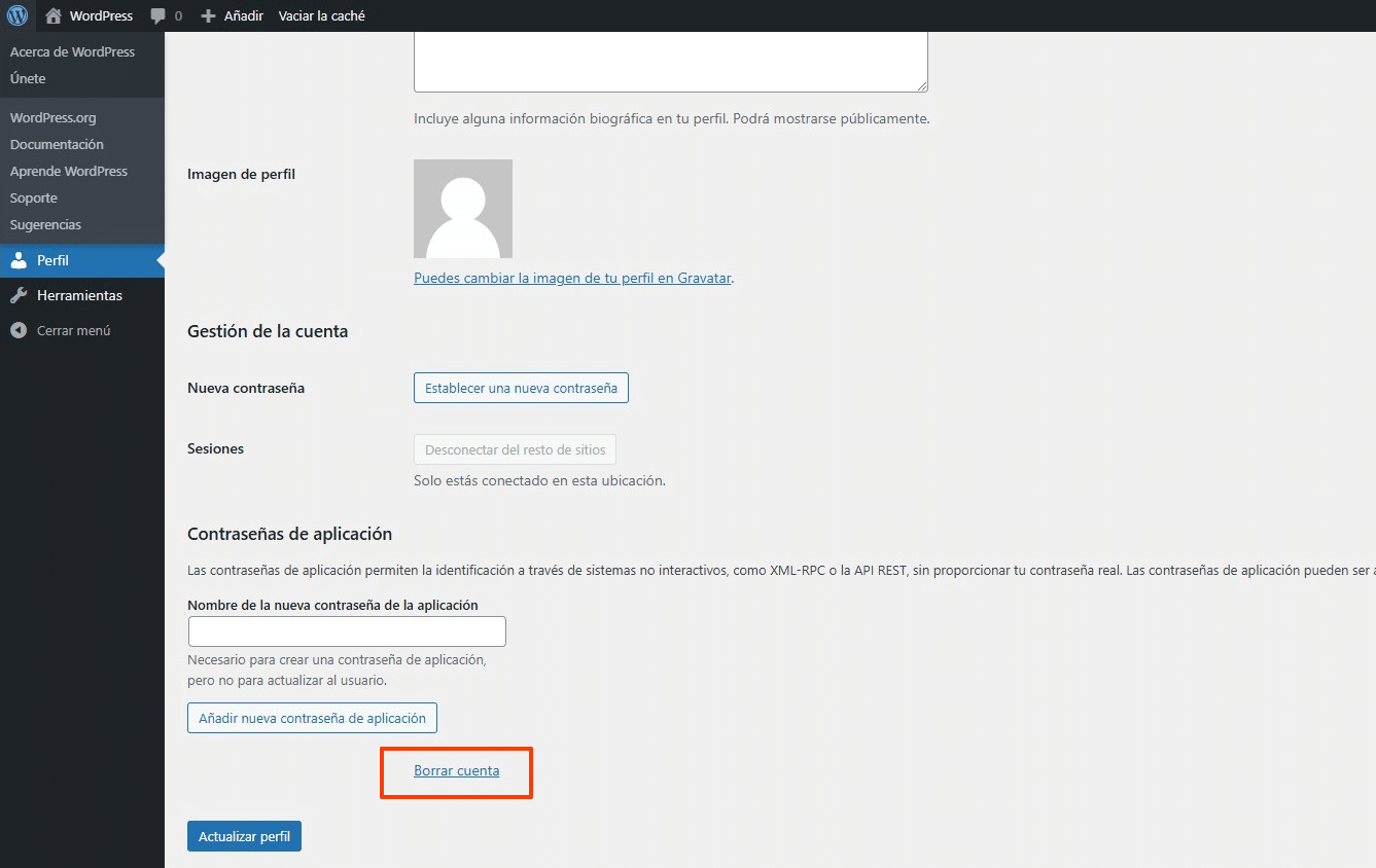 3) Añadir la opción de eliminar la cuenta de WordPress en el perfil del usuario