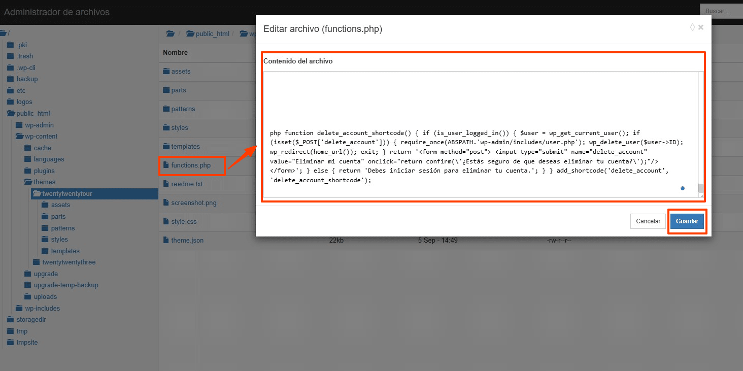 5) Alternativa: utilizar código personalizado para permitir al usuario eliminar la cuenta de WordPress.