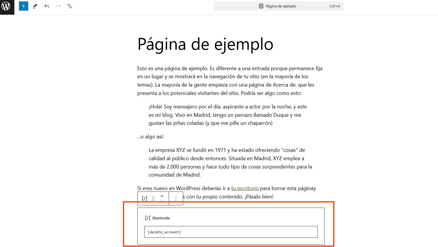 [delete_account]en el contenido de la página. Esto permitirá a los usuarios eliminar la cuenta de WordPress al hacer clic en el botón de confirmación.