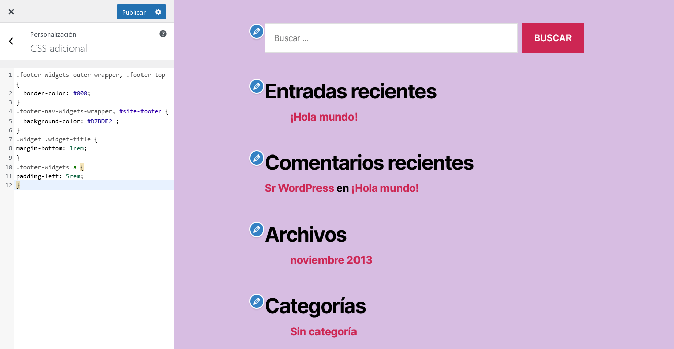 Si sólo deseas realizar pequeñas modificaciones en el pie de página, usa el campo CSS adicional en el Personalizador de WordPress. Por ejemplo, puedes cambiar el color de fondo, el margen y el relleno del área de contenido: