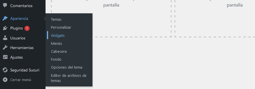 Para acceder al área de widgets, simplemente pasa el ratón por «Apariencia» en el escritorio de WordPress y selecciona Widgets.