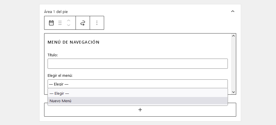 5. Vuelve a la página de Widgets de WordPress y agrega el widget Menú de navegación en la zona del pie de página.