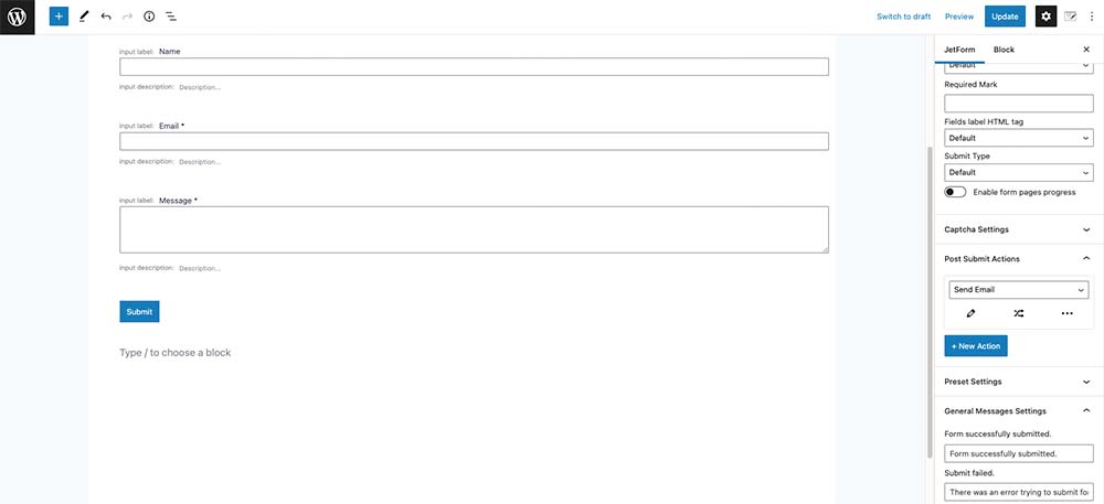 Una vez completado, publicamos nuestro formulario. Luego, podemos insertarlo en cualquier página de nuestro sitio utilizando el bloque JetForm Gutenberg.