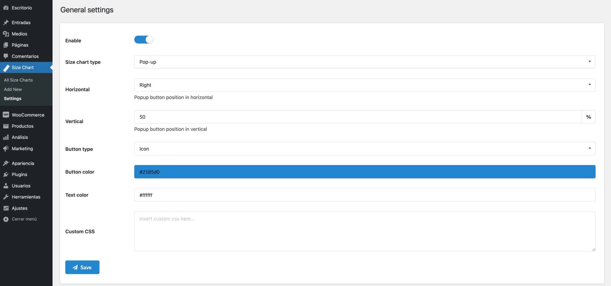 Además de poder configurar cada guía de talles en WooCommerce de manera individual, este tipo de plugins suele ofrecer una sección de ajustes generales. Desde allí, puedes personalizar aspectos globales como el diseño, los colores, las fuentes y el estilo general de todas las guías de talles que utilices en tu tienda online.