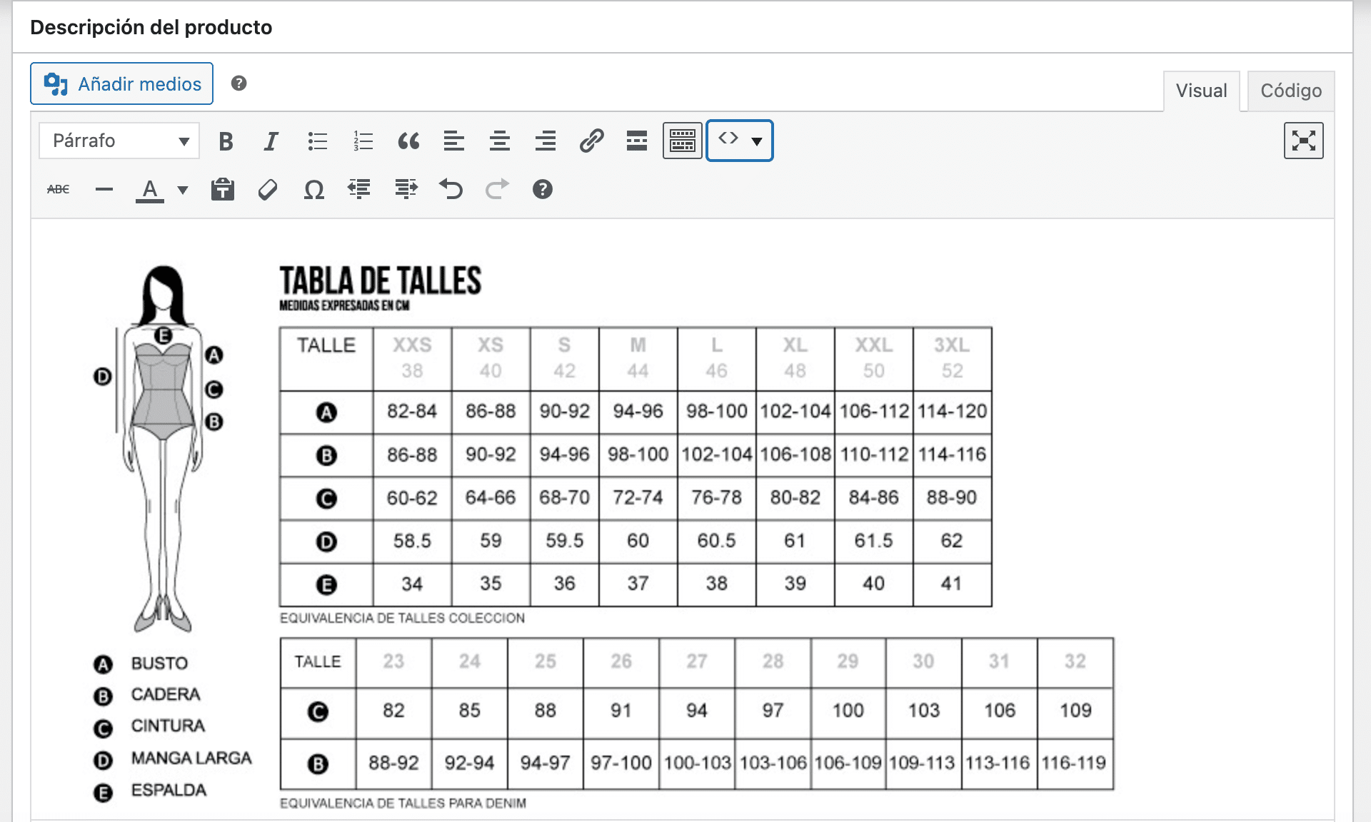 Si trabajas con el editor clásico de productos, puedes crear la tabla de talles en tu aplicación de hojas de cálculo preferida, como Excel o Google Sheets, y luego copiar y pegar la tabla directamente en el campo de contenido. Esto es rápido y sencillo.